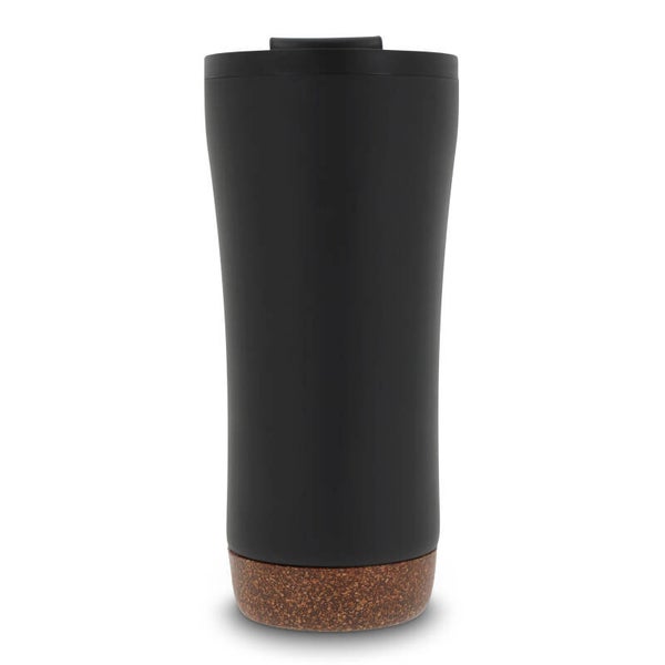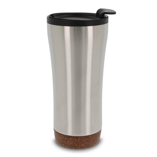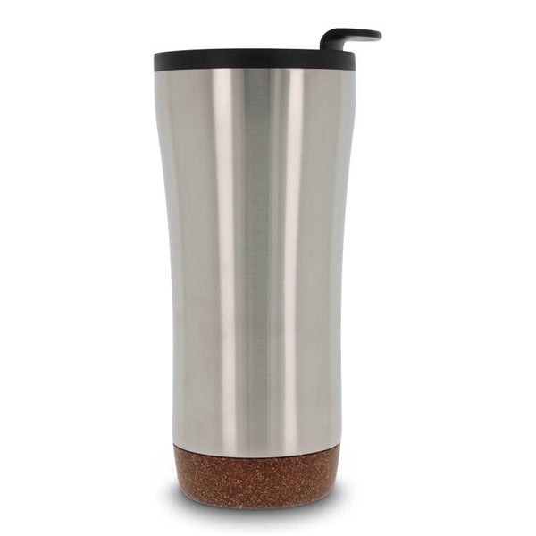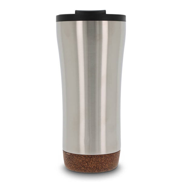 Dubbelwandige koffie beker met deksel. Roestvrijstaal aan de buitenkant en PP aan de binnenkant. Dit model houdt koffie/thee langer warm door de dubbelwandigheid en de afsluitbare deksel met drinkopening. De onderkant is gemaakt van kurk wat er voor zorgt dat de onderkant niet krast en het voorkomt koffiekringen op de tafel van koffie die langs de fles druppelt. Wordt geleverd in een geschenkverpakking