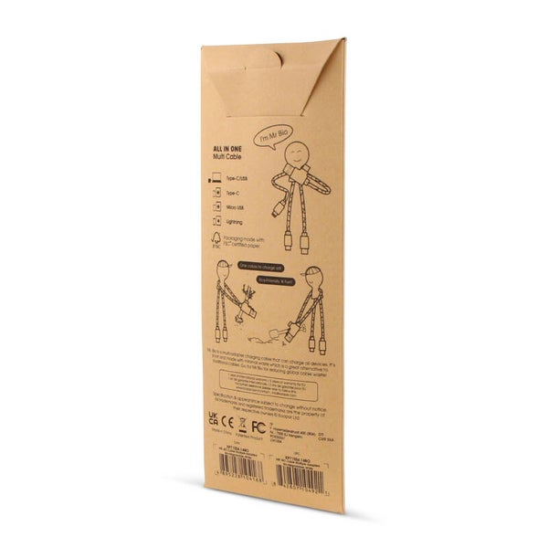 Mr. Bio is een multi-oplaadkabel, met een dubbele USB & USB-C ingangsconnector en drie verschillende connectoren om je apparaten ecologisch op te laden! Mr. Bio is gemaakt van gerecycled plastic & DuPont Tyvek kabels. De totale gerecyclede inhoud is 61% op basis van het gewicht van het product. De kabel is verpakt in een duurzame FSC-gecertificeerde papieren envelop. Xoopar-producten mogen niet worden verkocht in Frankrijk en Spanje.