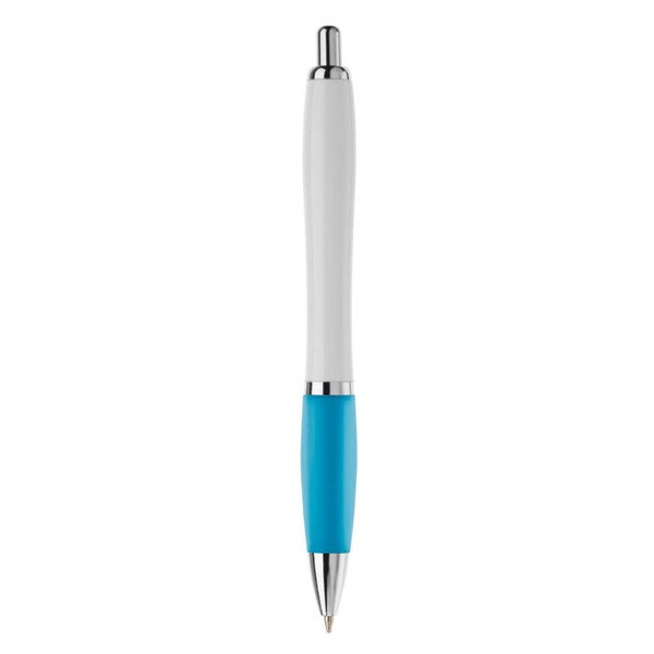 Witte balpen met metalen clip en metal look drukknop, ring en punt. De pen bevat een blauwschrijvende Jumbo vulling.