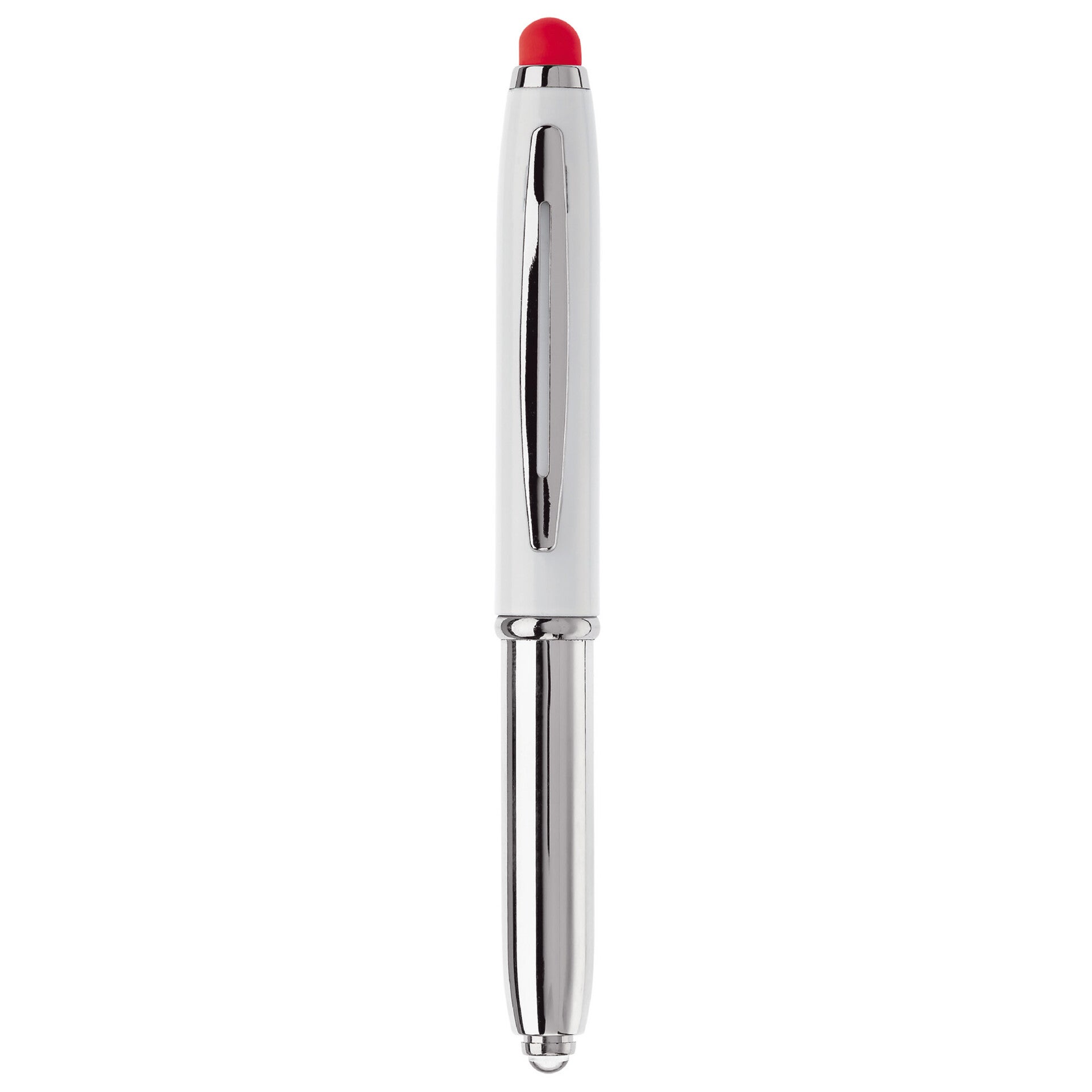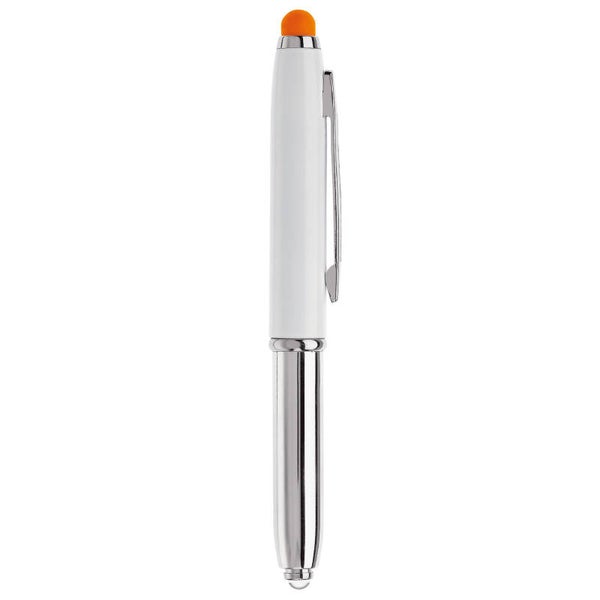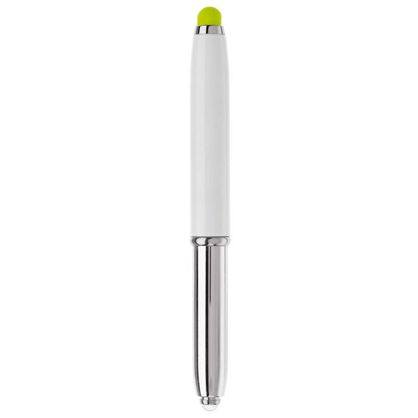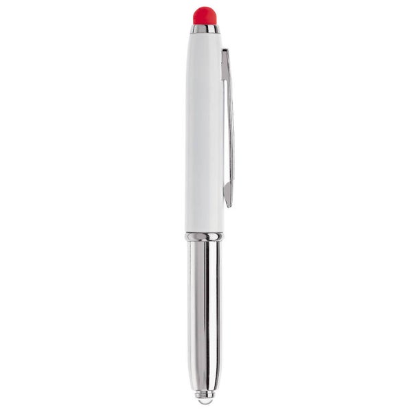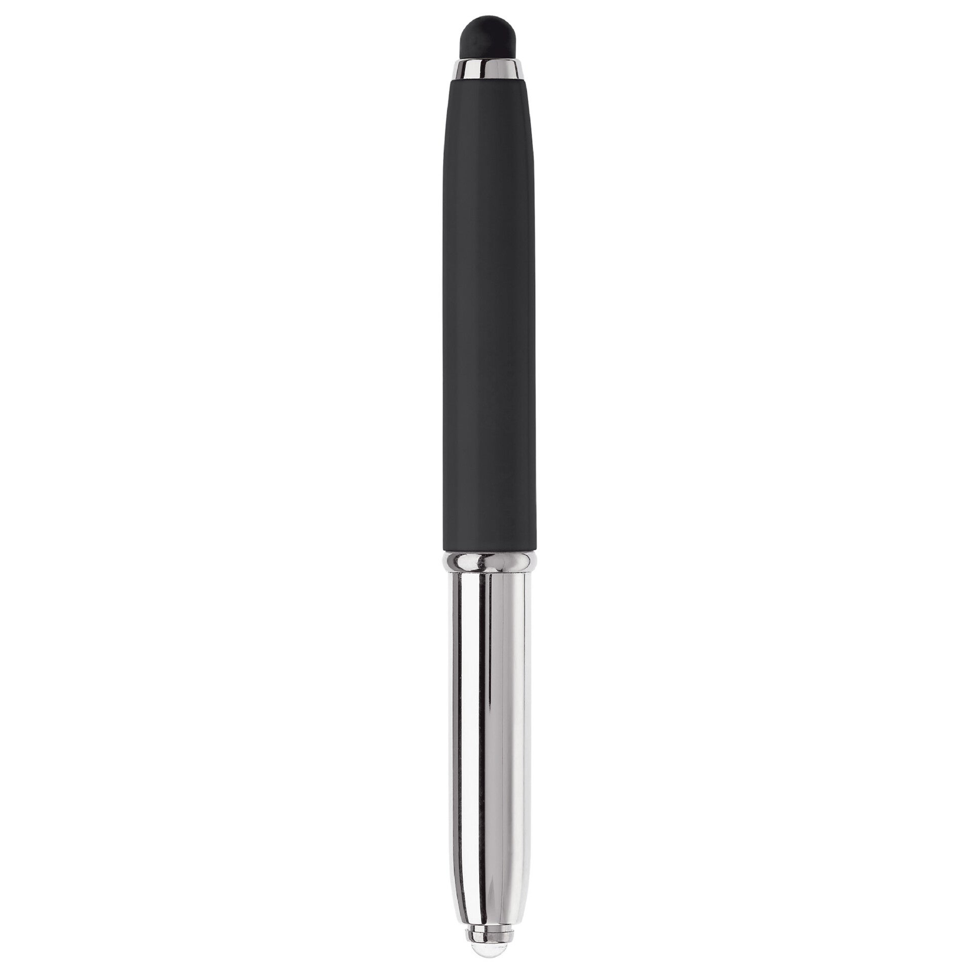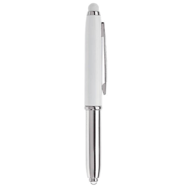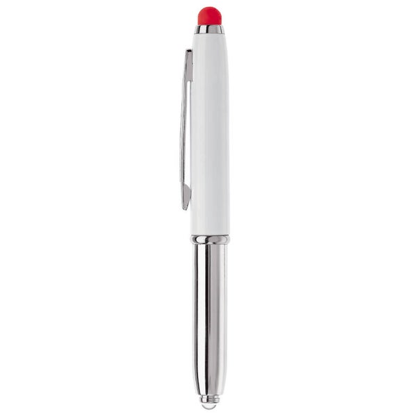 Touchscreen pen met lampje en balpen. Balpen te gebruiken door dop eraf te halen. Blauwschrijvend.