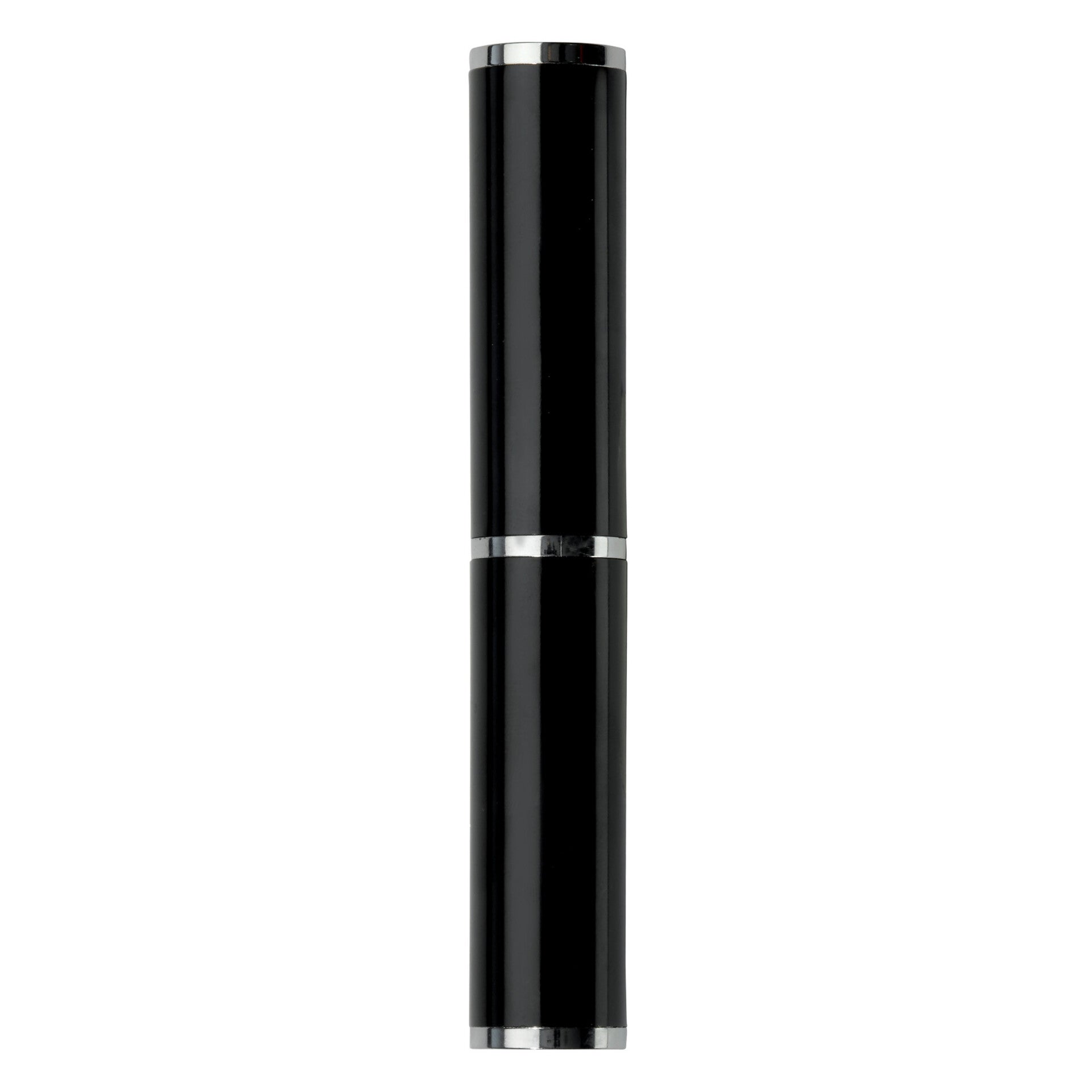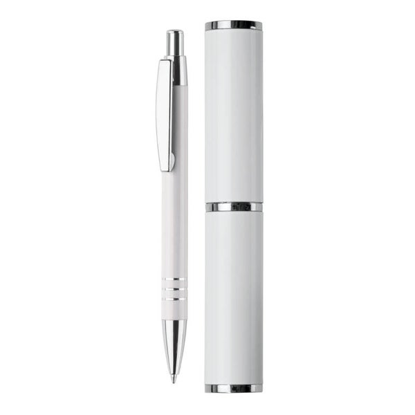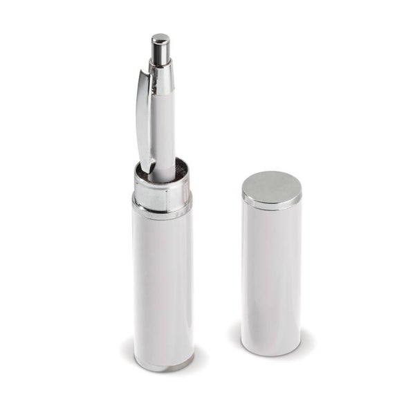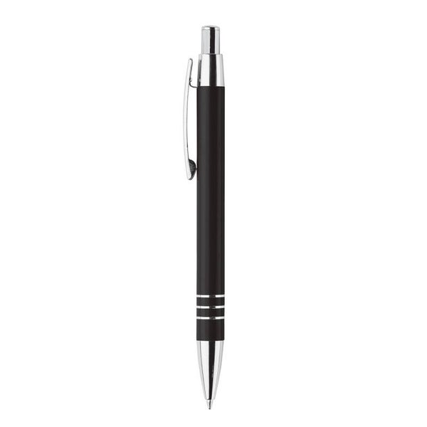 Aluminium balpen met drie verchroomde ringen. De balpen zit verpakt in een aluminium koker. Wordt geleverd met blauwschrijvende vulling.