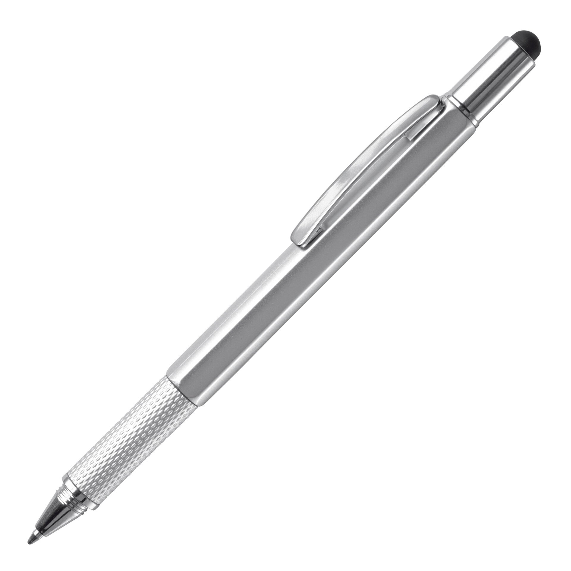 Multifunctionele balpen met stylusfunctie inclusief een waterpas, schroevendraaier en lineaal. Blauwschrijvend.