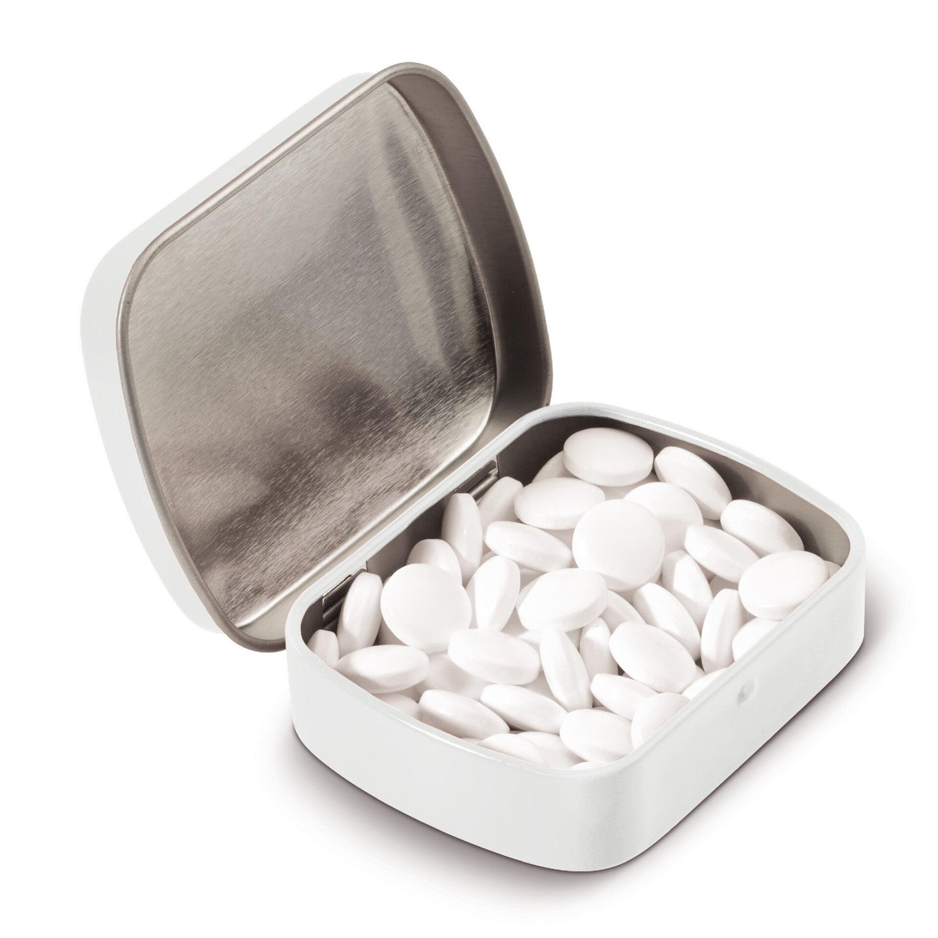 Scharnieren pepermuntblikje. Gevuld met 23 gram Europese pepermunt. Altijd verfrissende pepermuntjes bij de hand. Niet suikervrij.