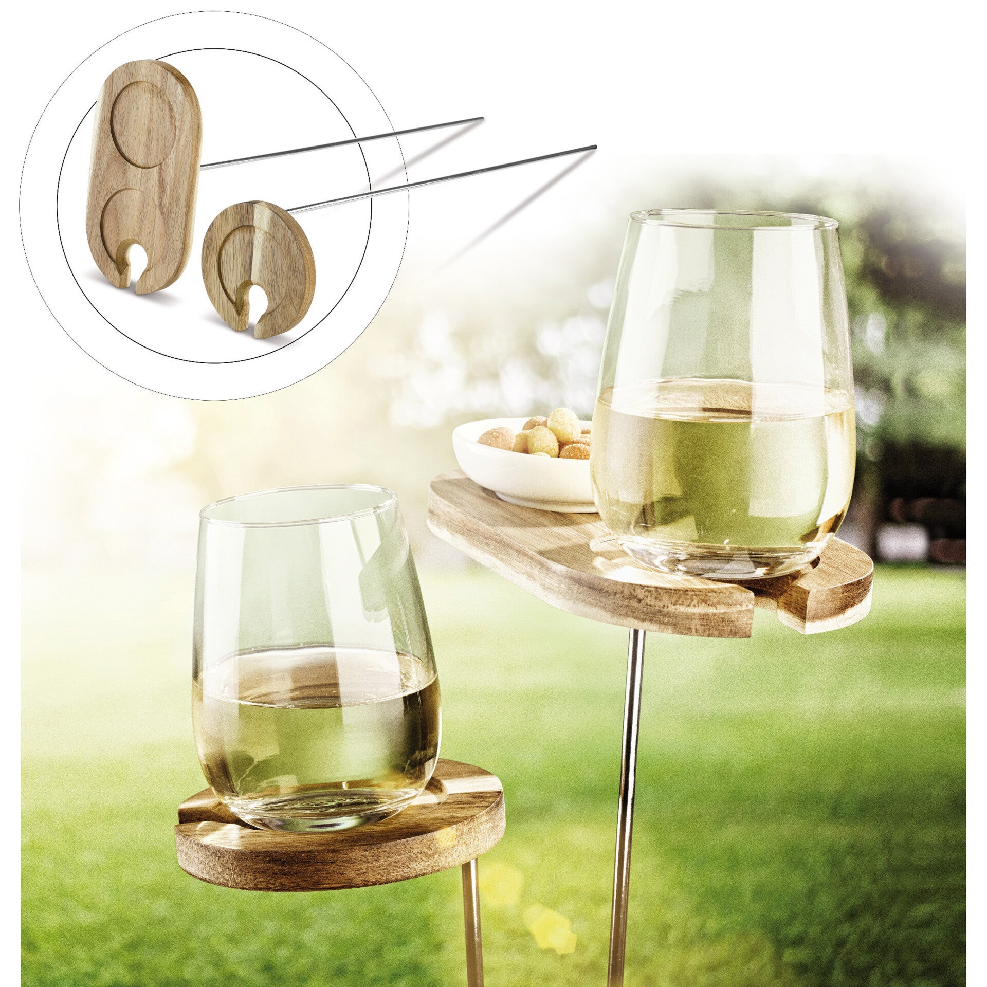 Steek de lange pinnen in de grond en plaats in of op de houten houder je glas en 1 van de pinnen heeft ook ruimte voor een schaaltje. Wordt in een geschenkverpakking geleverd.